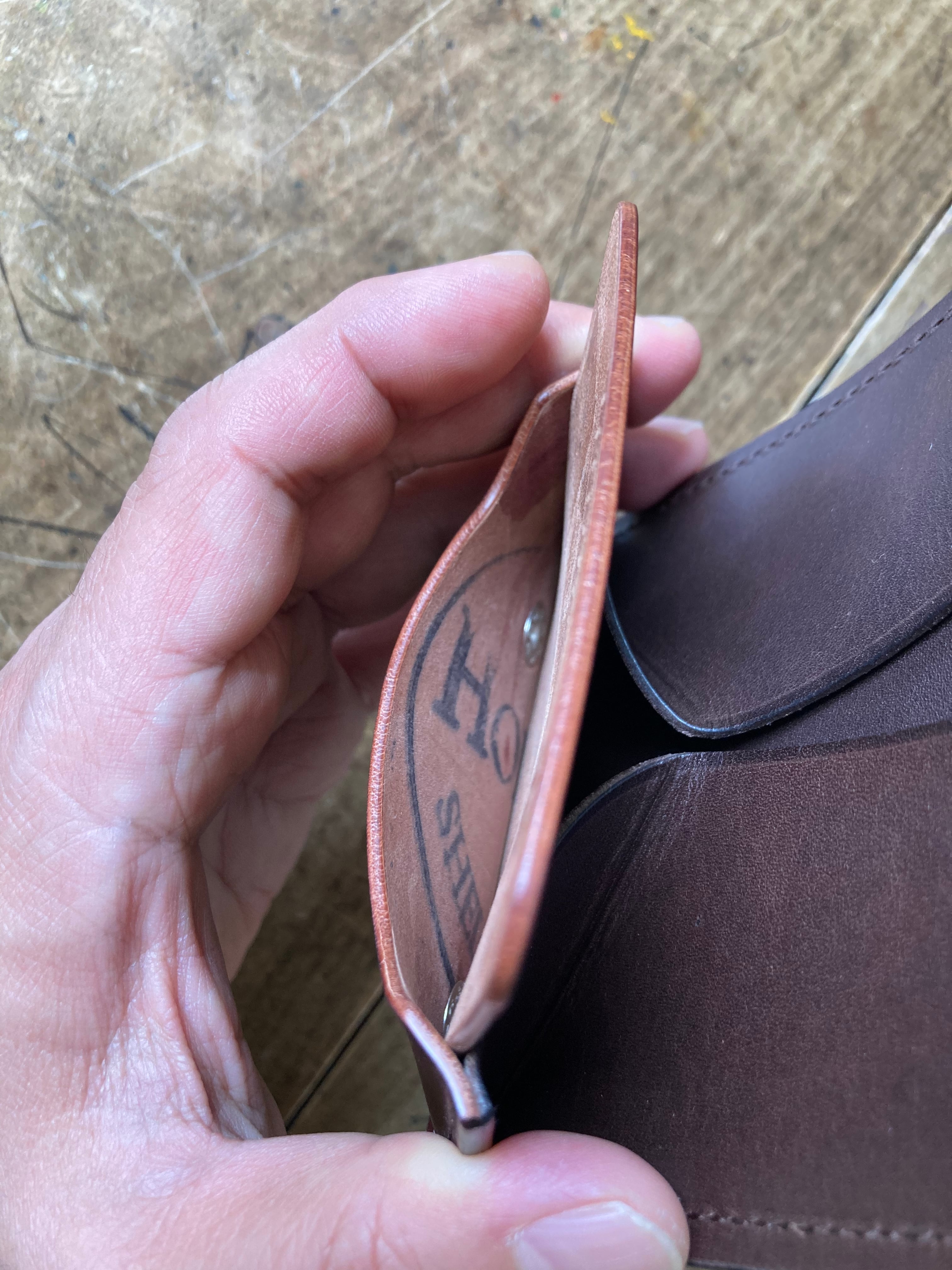 ギャルソン型小銭入れの革のクロス部分(ロゴの刻印部分)が